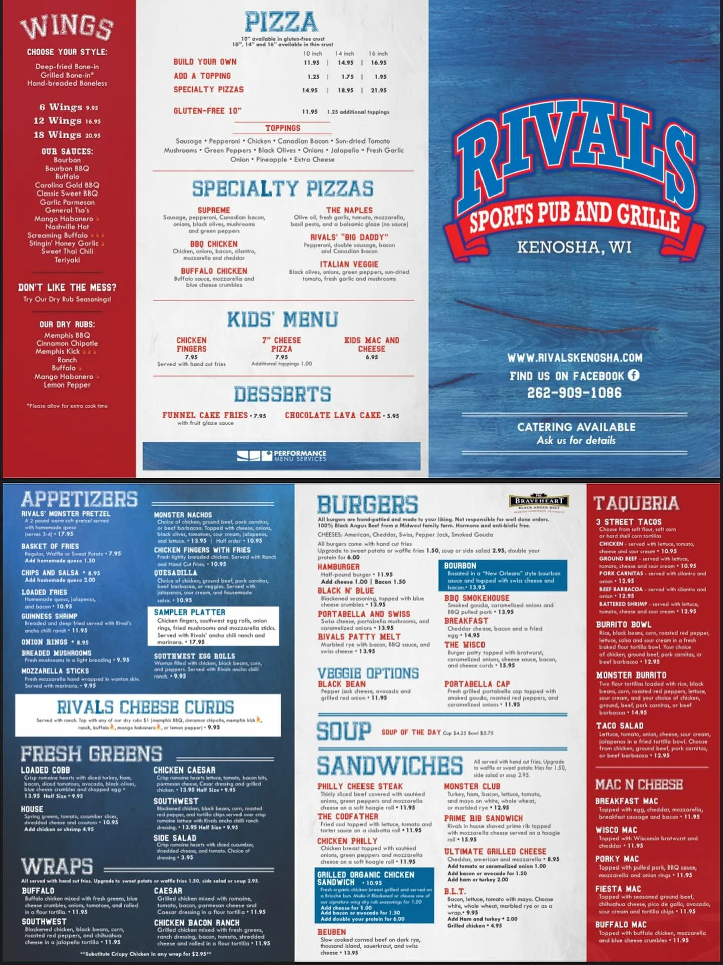 We offer catering for orders over $150, with advance notice. Create a custom menu with our head chef, Paul Benigno! Please contact RivalsKenosha@gmail.com for more information on how to get started!